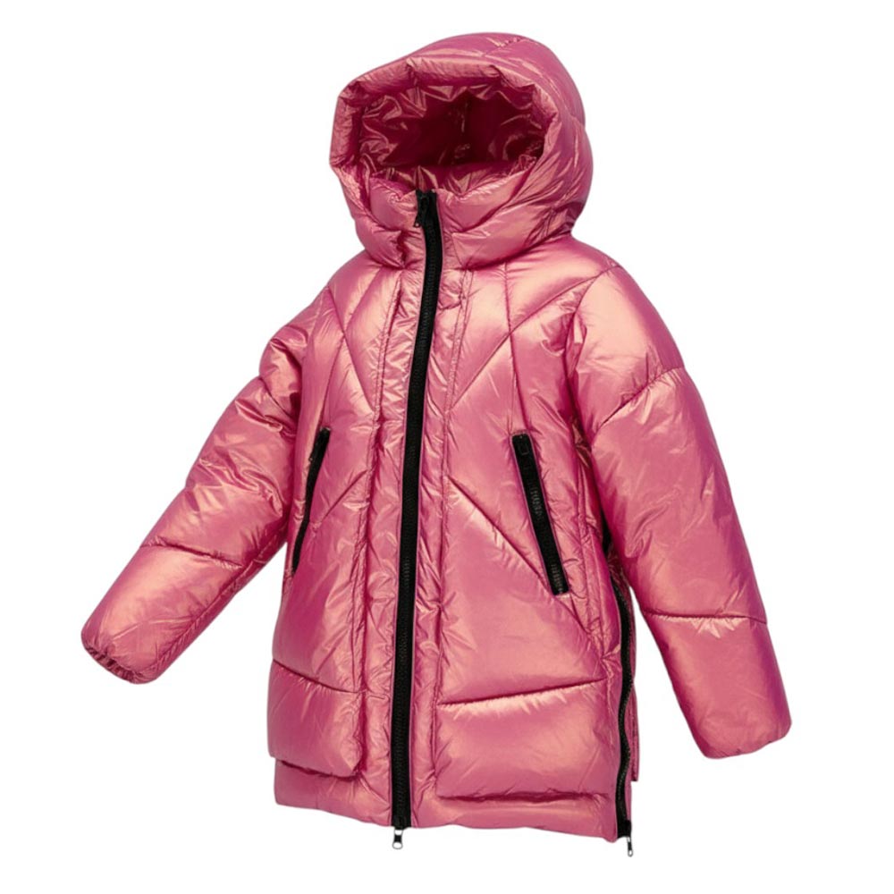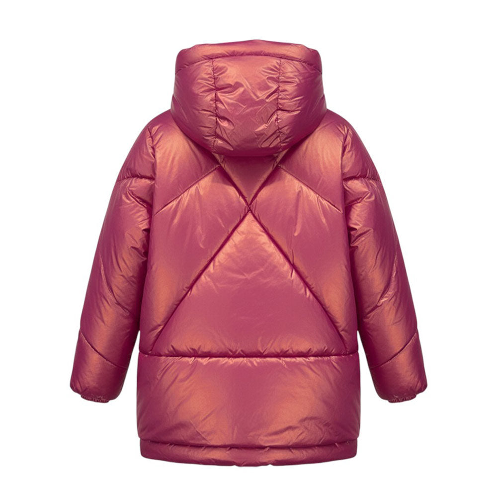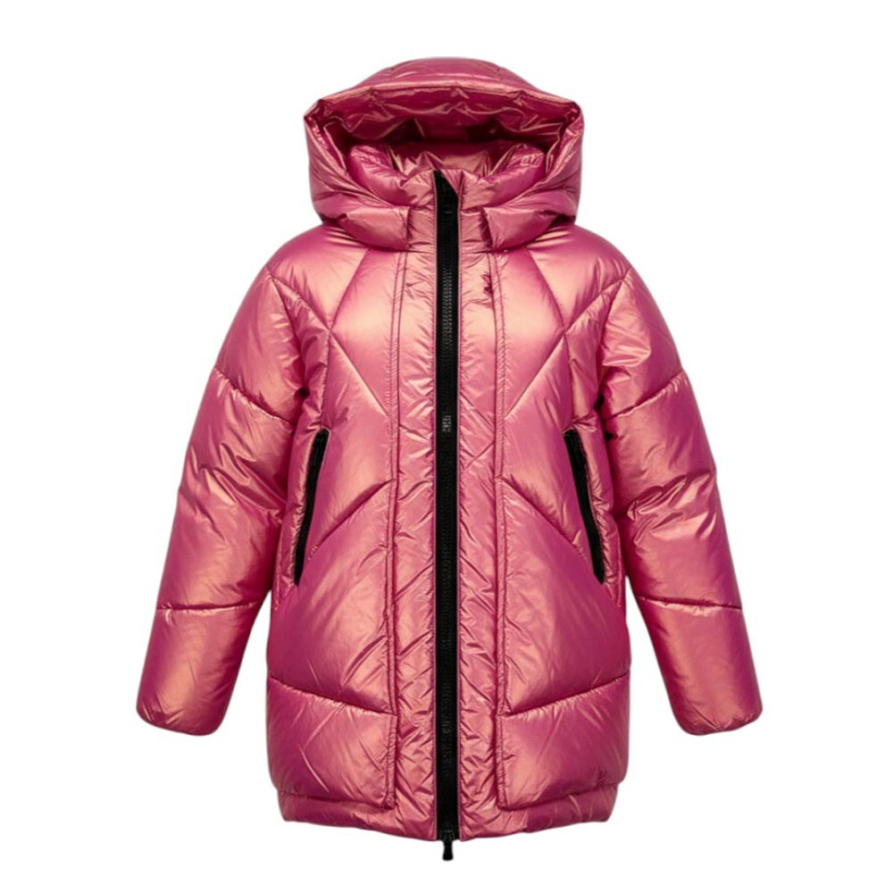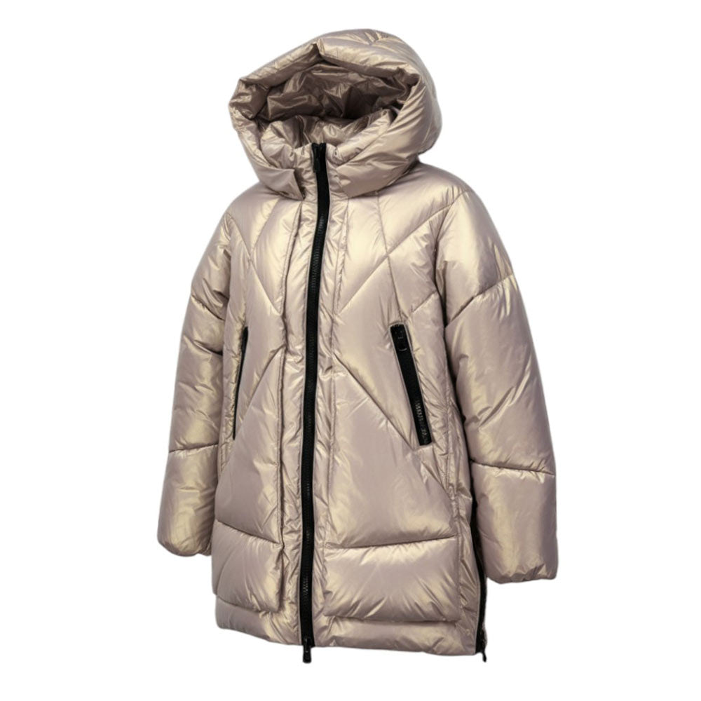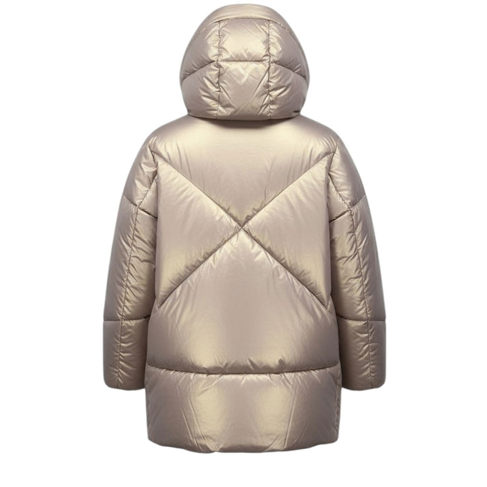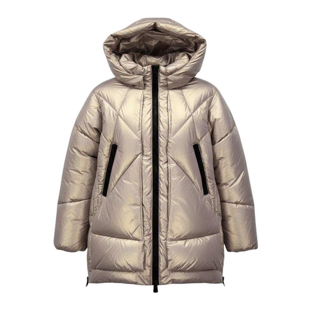 Giubbino imbottito realizzato in nylon effetto madreperla. Presenta design trapuntato a due strati, collo alto, cappuccio fisso, chiusura frontale con zip, maniche lunghe con polsi elasticizzati, due tasche laterali all'americana con zip e due chiusure apribili sui lati.