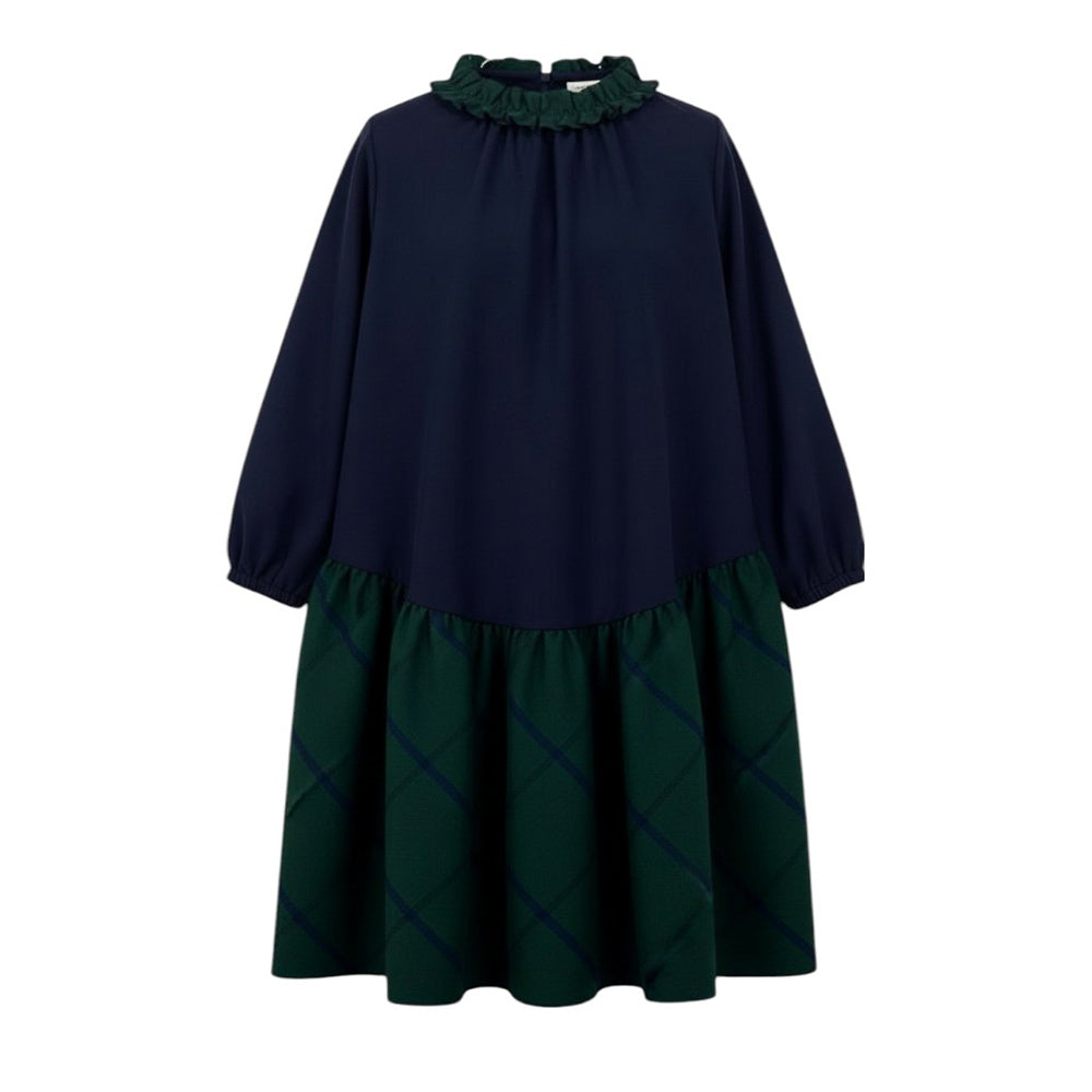 Abito realizzato in jersey di misto viscosa. Presenta colletto rotondo con ruches, maniche lunghe con polsini elasticizzati, chiusura posteriore nascosta con zip e gonna a balze in fantasia tartan.