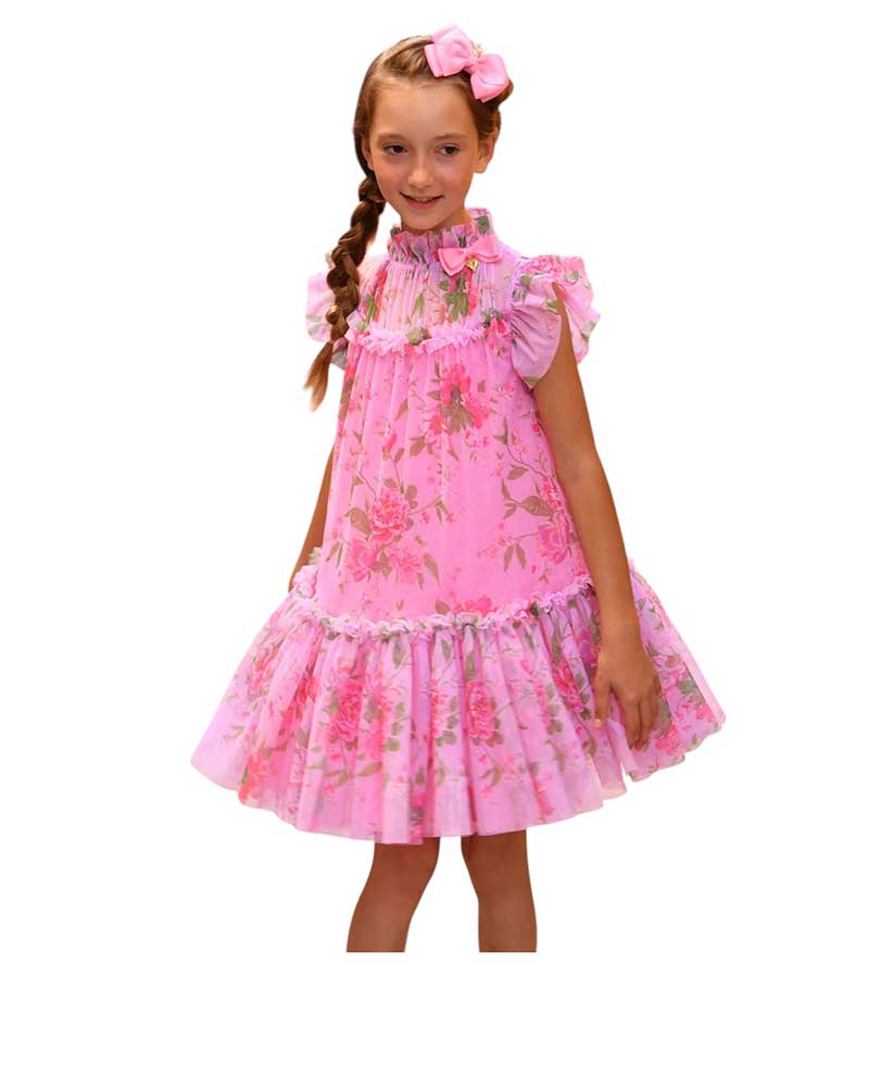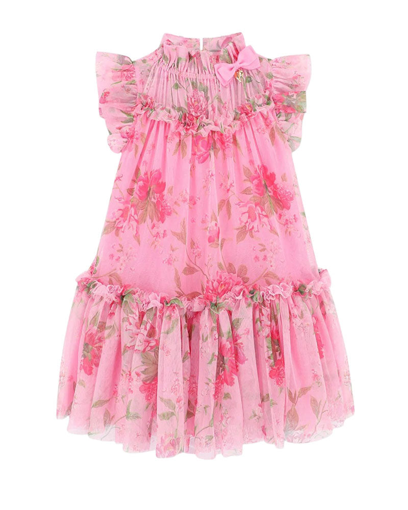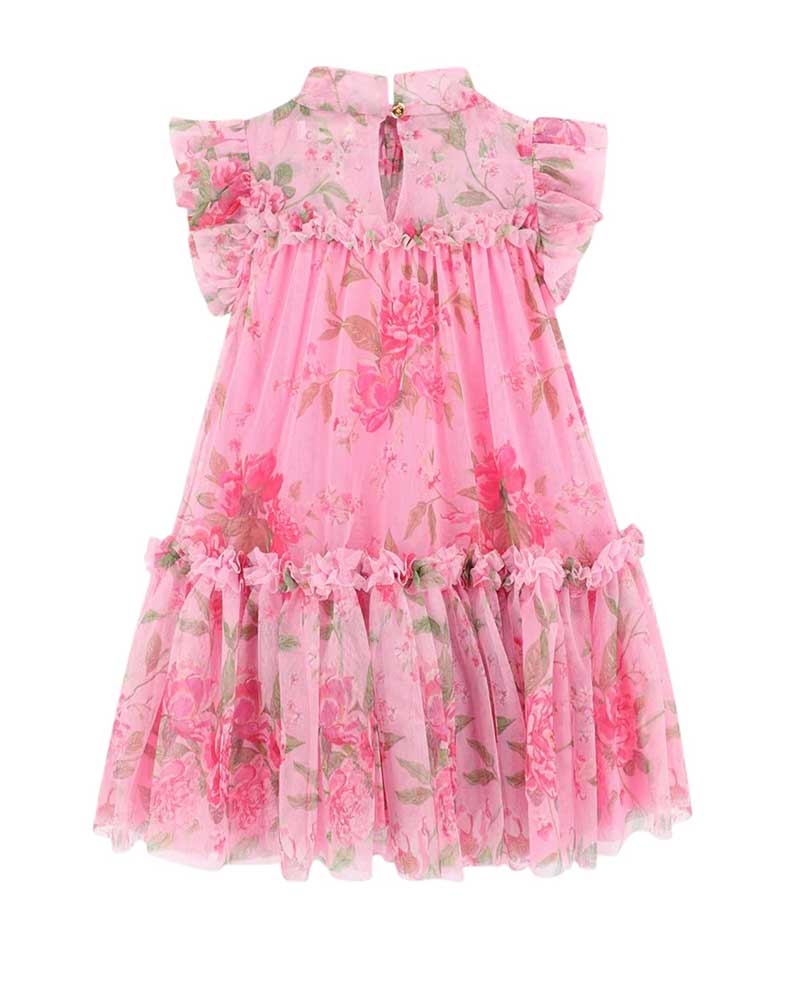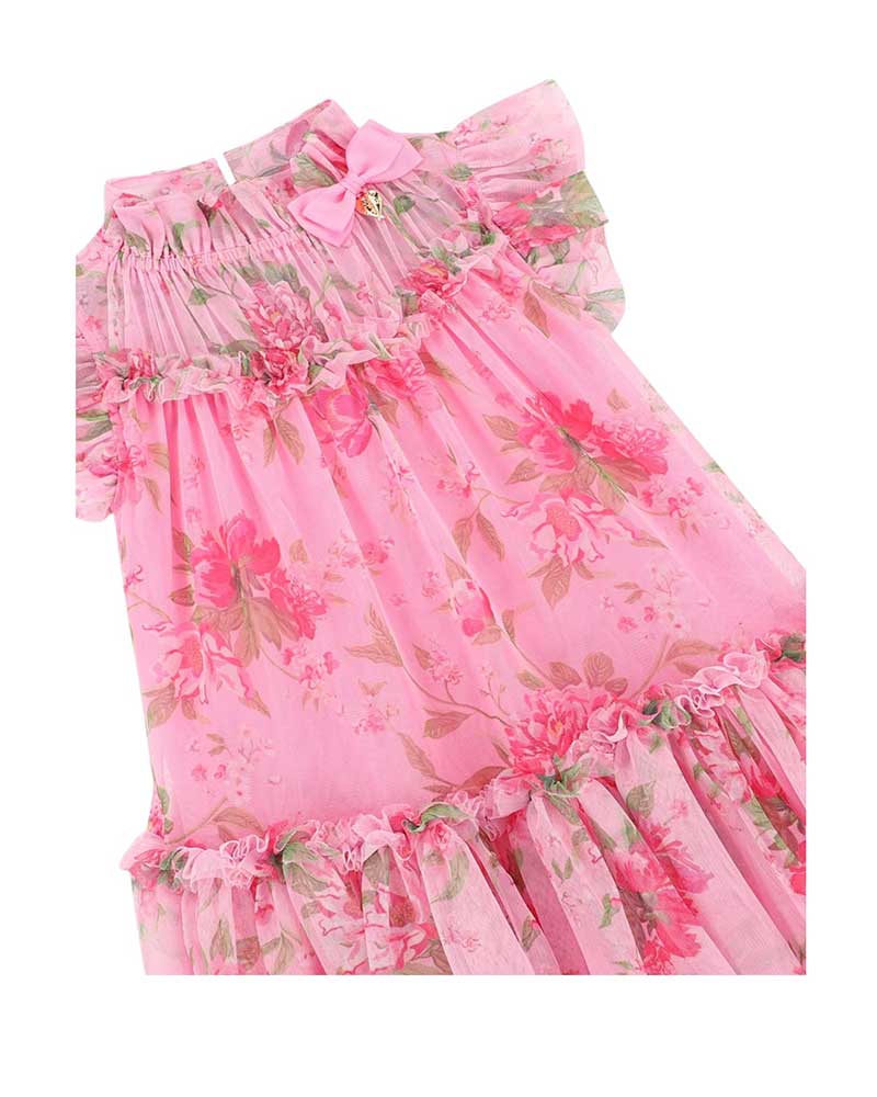 Abito in morbido tulle in fantasia floreale, collo e maniche con ruches, balza all'orlo, chiusura con bottone sul retro, fiocco e dettaglio in metallo oro applicato sulla spalla.