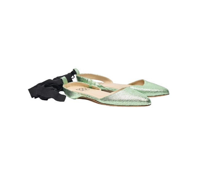 BALLERINA A PUNTA IN PELLE STAMPA SERPENTE IN COLORE VERDE LAMINATO CON LACCIO ELASTICO NERO DA ALLACCIARE ALLA CAVIGLIA
