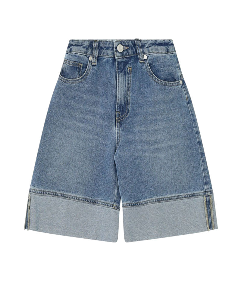 Bermuda realizzato in denim di cotone, modello cinque tasche, chiusura frontale con bottone e zip, piega all'orlo.