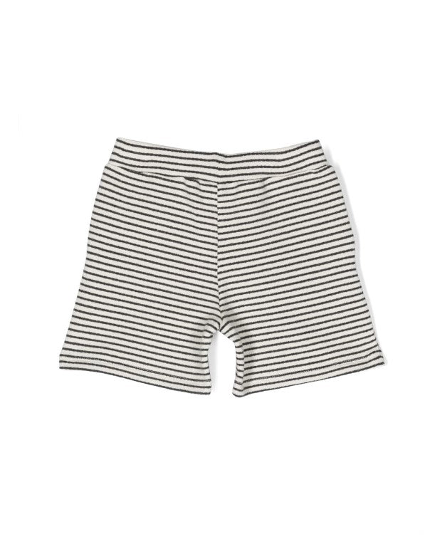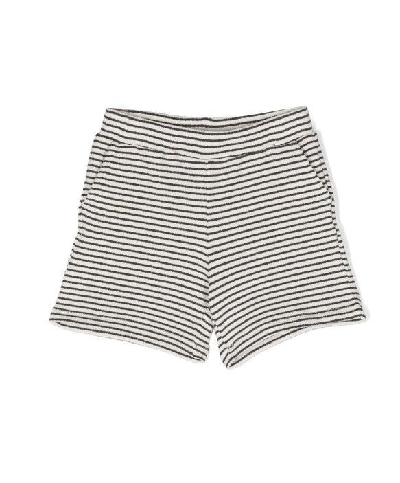 Bermuda in filo di cotone, vita elasticizzata, fantasia a righe.