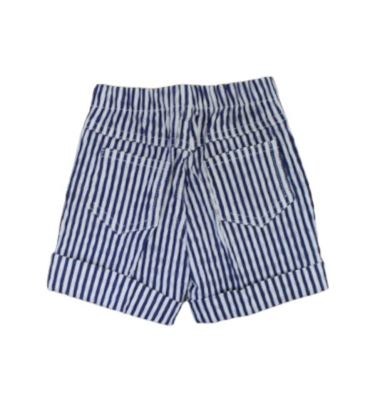 Bermuda in cotone in fantasia rigata, vita elasticizzata, tasche alterali, bottone decorativo.