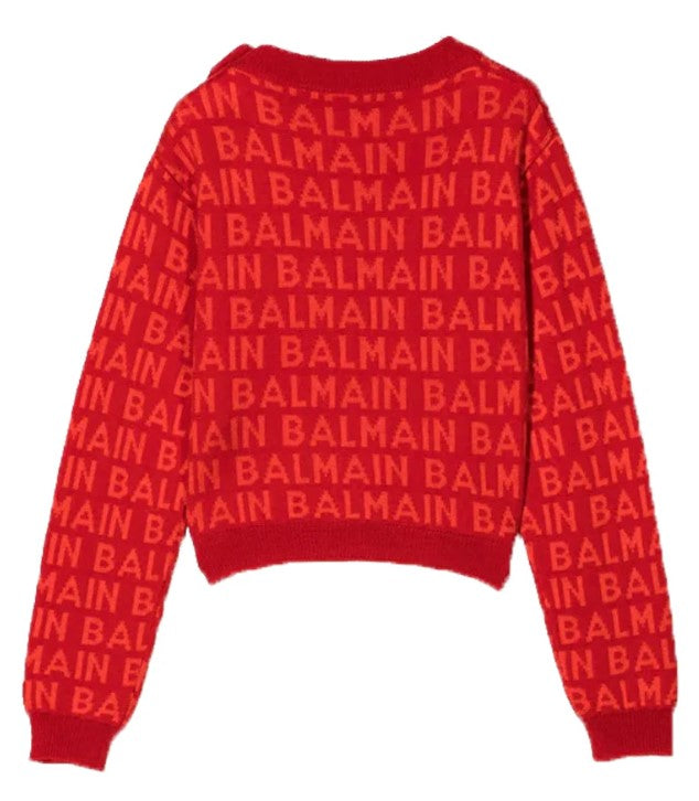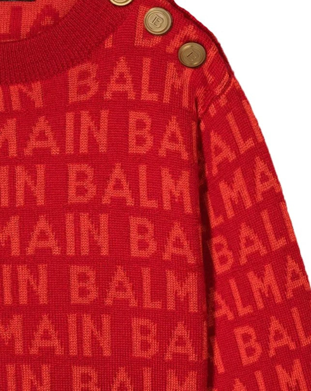Maglia girocollo a manica lunga, modello cropped, fantasia logo all-over, bottoni logati sulla spalla.