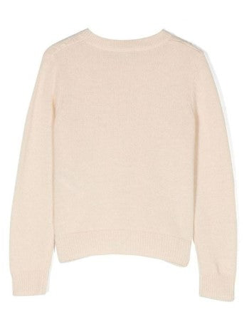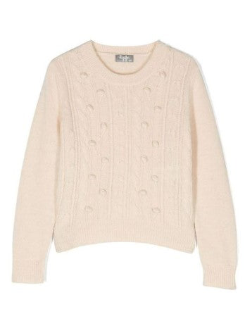 Maglia girocollo in lana, motivo a treccia con applicazione pon pon sul davanti.