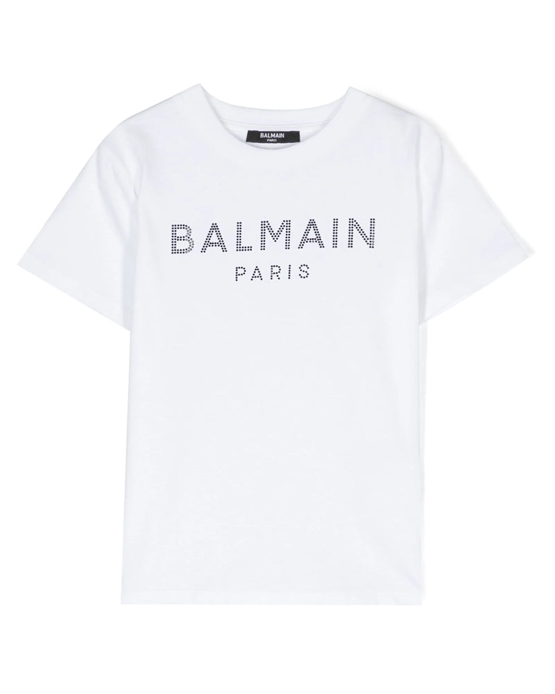 T-shirt in cotone con logo decorato di strass. Modello con girocollo, spalla cadente, maniche corte e orlo dritto.