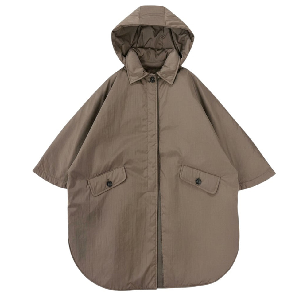 Mantella 100 grammi da bambina, realizzata in nylon. Presenta colletto a punta, cappuccio rimovibile, chiusura frontale con bottoni, due tasche con patta sul davanti e orlo asimmetrico.