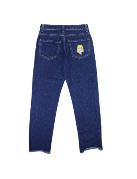 Jeans in denim di cotone, modello cinque tasche, chiusura frontale con bottone e zip. Simbolo ricamato sulla tasca posteriore.