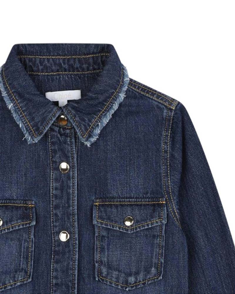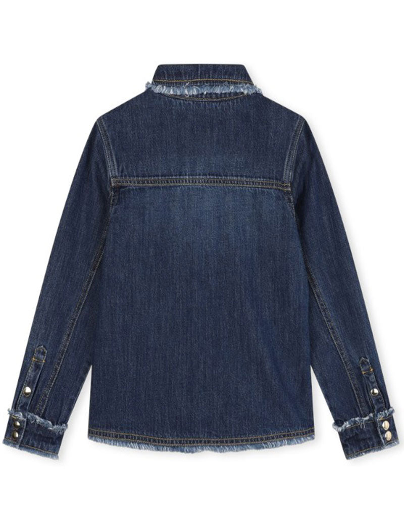 Camicia da bambina realizzata in denim di cotone con dettagli sfrangiati. Presenta colletto a punta, chiusura frontale con bottoni a pressione, maniche lunghe, due tasche con patta applicate sul petto e orlo dritto.