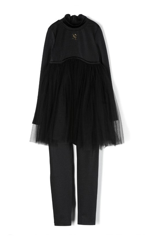 Tuta intera a manica lunga in nylon da bambina, applicazione logo color oro sul davanti, gonna in tulle, chiusura posteriore con zip.