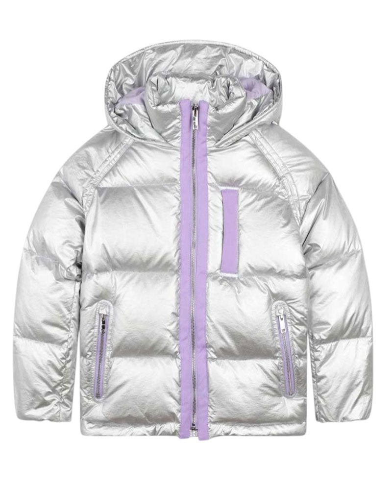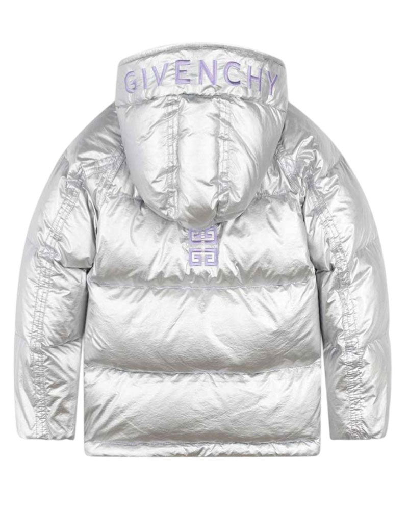 Giubbino imbottito da bambina di Givenchy Kids, realizzato in nylon lucido. Presenta design trapuntato, cappuccio fisso, chiusura frontale con zip, maniche lunghe con polsi elasticizzati, un taschino a filetto con zip sul davanti, due tasche a filetto con zip laterali e orlo dritto con coulisse regolabile. È decorato con logo ricamato sul cappuccio e iconico simbolo del brand ricamato sul retro.