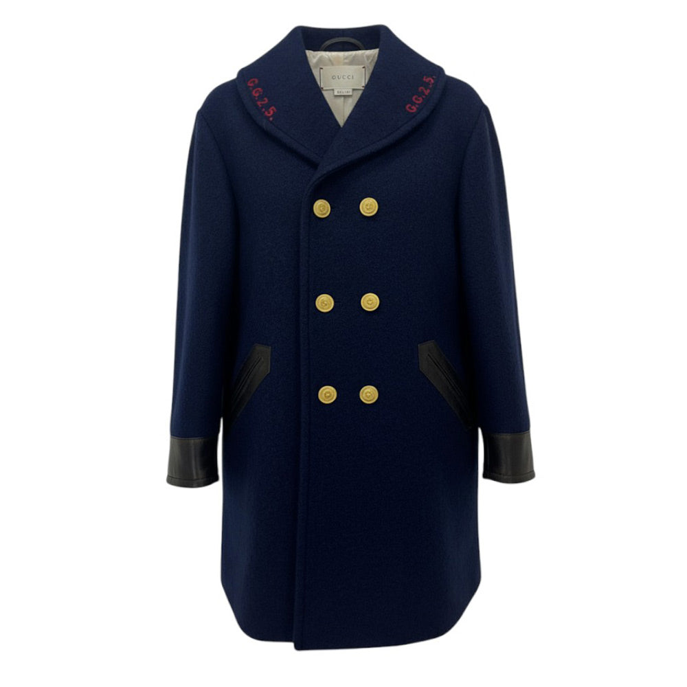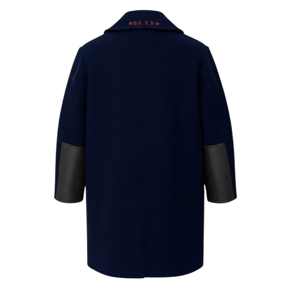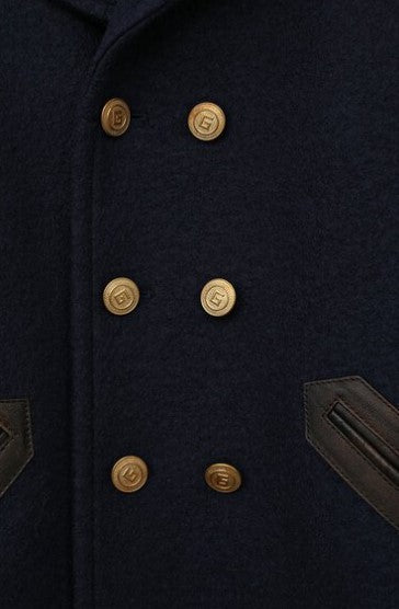 Cappotto doppiopetto realizzato in lana, caratterizzato da collo a revers, chiusura frontale con bottoni logati, maniche lunghe e due tasche laterali all'americana. È decorato con inserti in pelle di vitello e con ricami a contrasto colore.