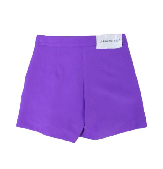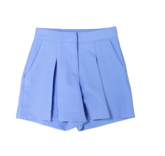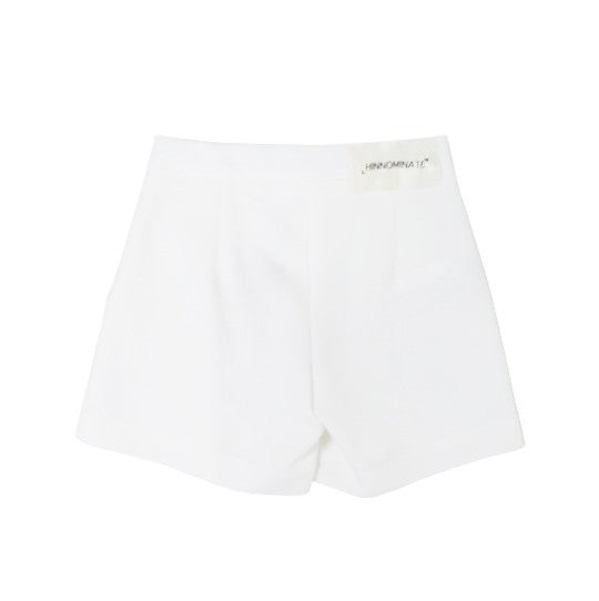 Shorts a vita alta con pinces sul davanti da bambina, tasche laterali america, chiusura frontale nascosta con gancio e zip, patch logo applicato sul retro.