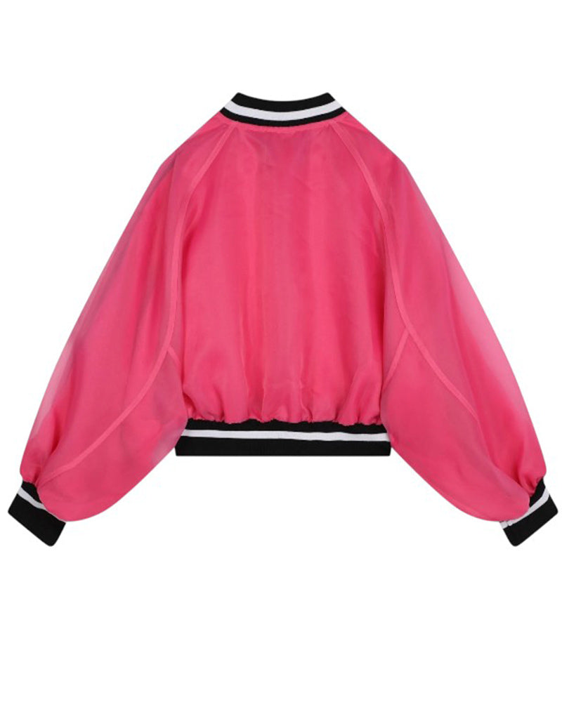 Giubbino leggero da bambina, caratterizzato da colletto alla coreana, chiusura frontale con zip, maniche lunghe con bande a contrasto, due tasche laterali e finiture a coste. È decorato con patch logo applicata sul davanti.
