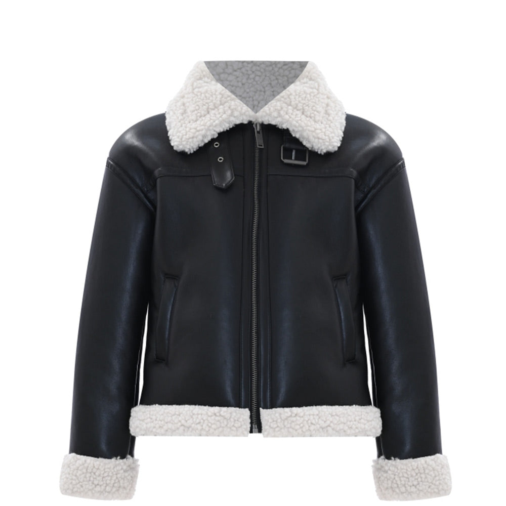 Montone realizzato in similpelle da bambina, caratterizzato da colletto a revers, chiusura frontale con zip, maniche lunghe, due tasche laterali all'americana, orlo dritto e finiture in morbido tessuto effetto teddy,