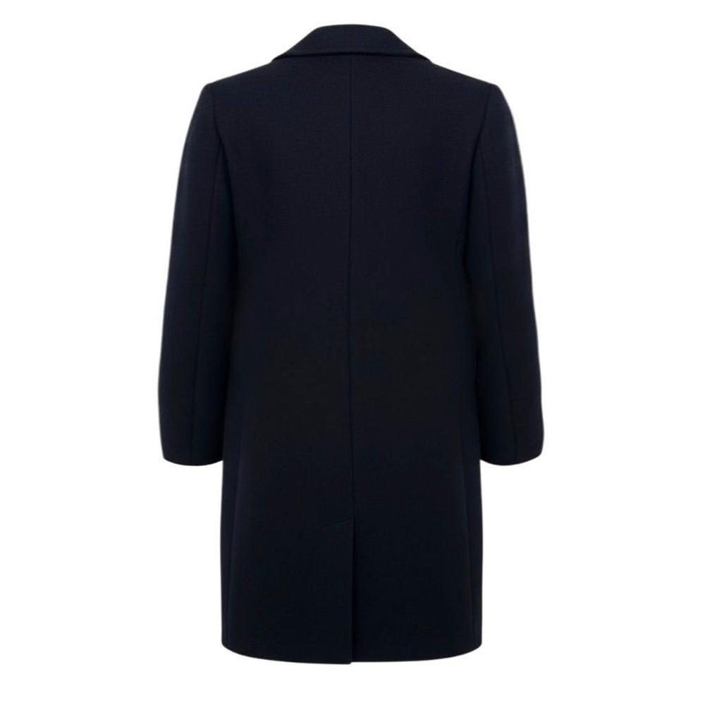 Cappotto doppiopetto realizzato in twill di misto lana, presenta taglio dritto, collo a revers, chiusura frontale con bottoni logati, maniche lunghe, due tasche a filetto e due tasche con patta sul davanti.