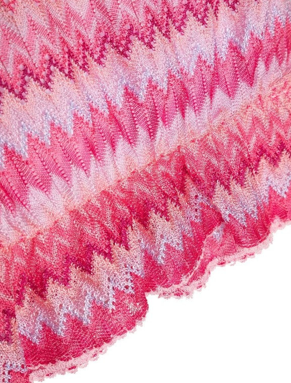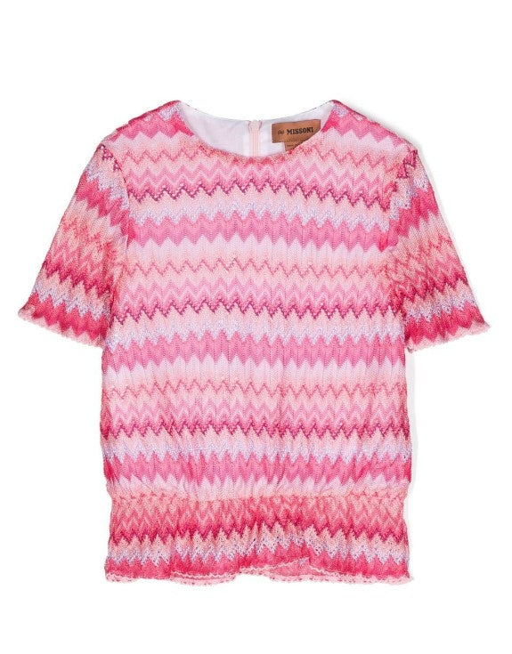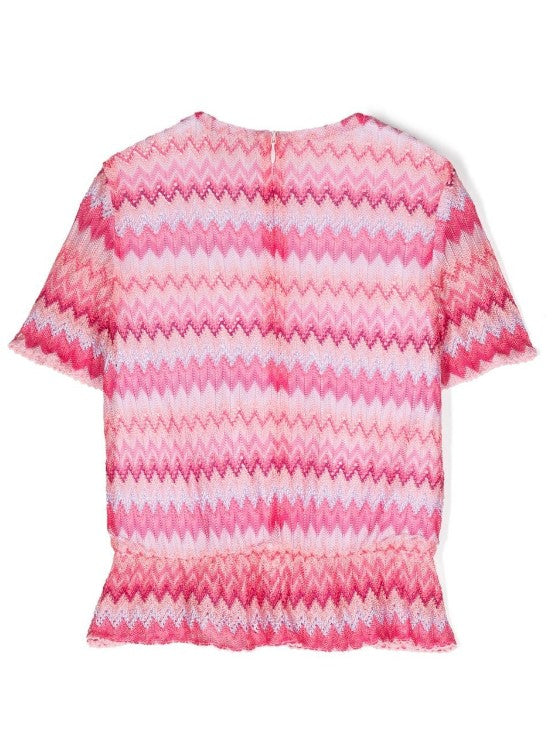 Casacca girocollo a manica corta in tessuto traforato, fantasia multicolor, chiusura posteriore.