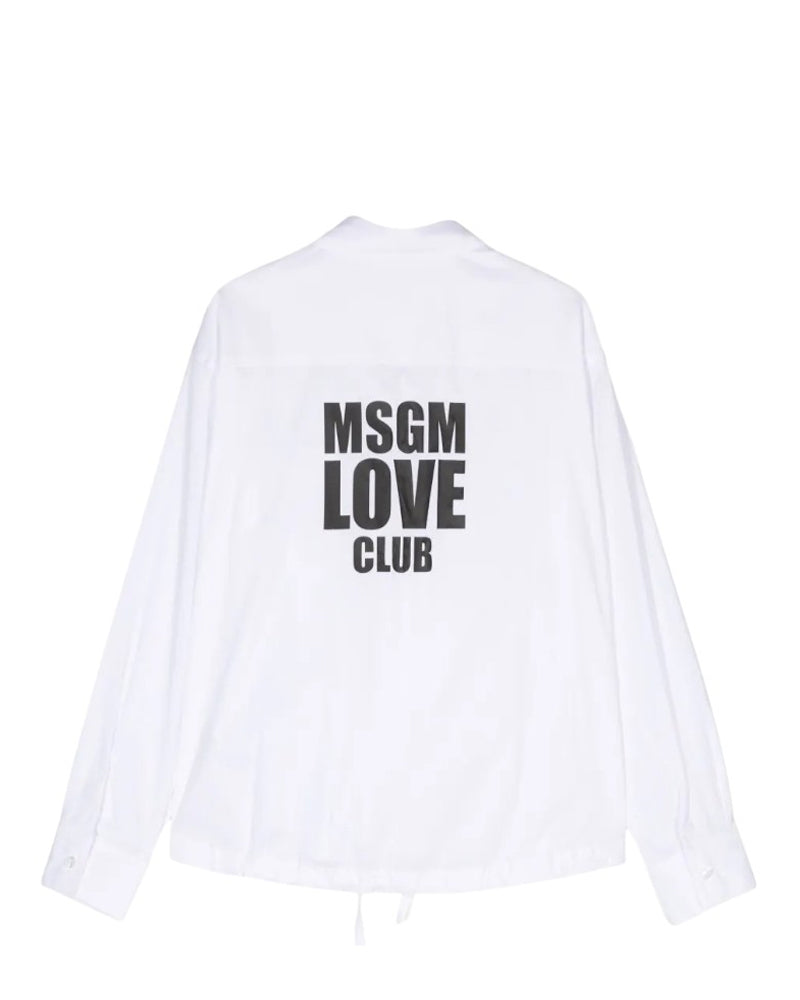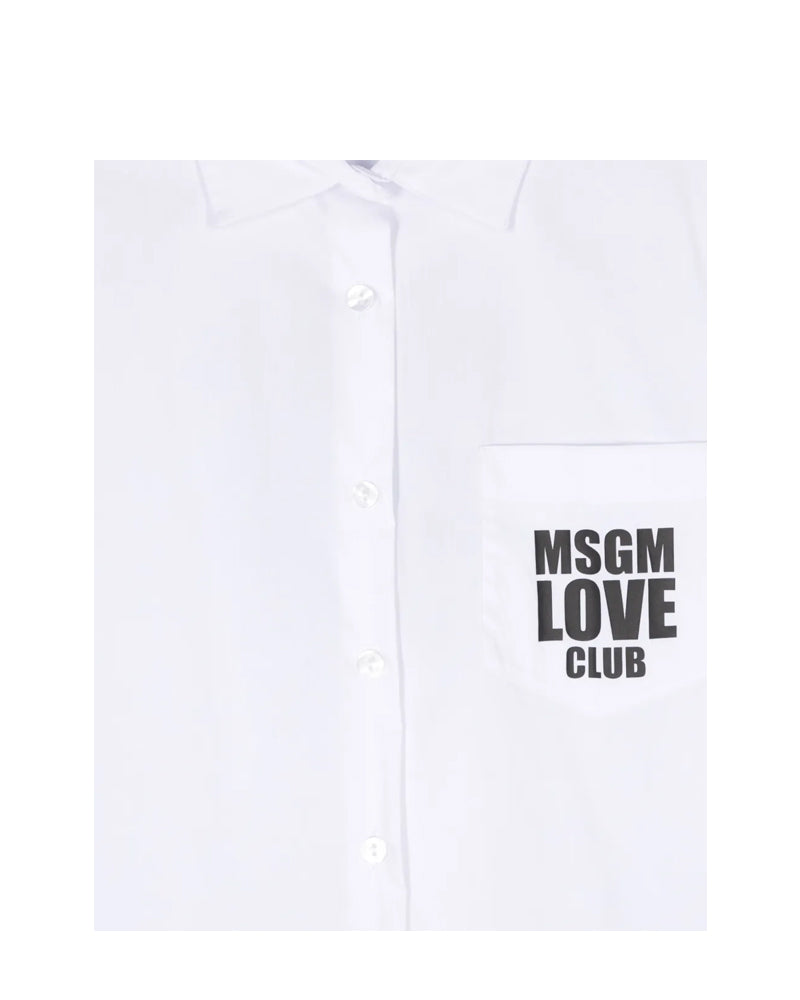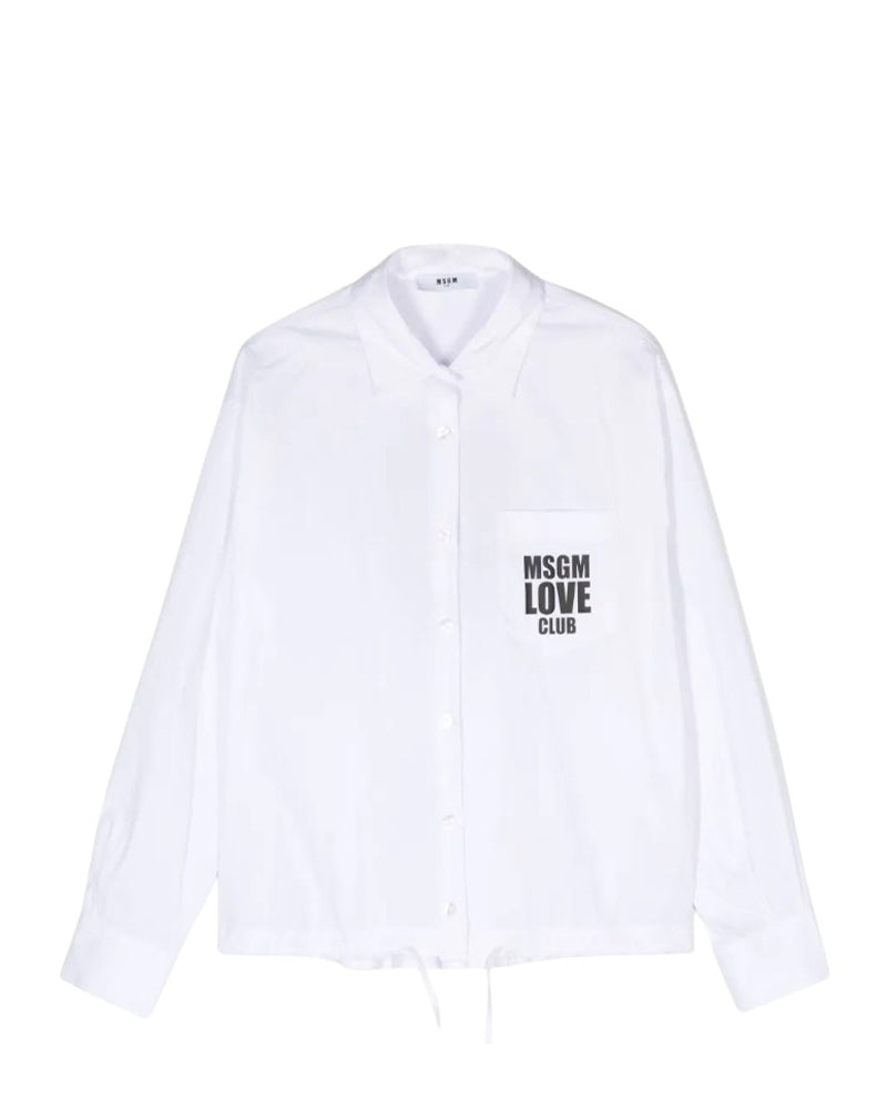 Camicia realizzata in popeline di cotone da bambina. Presenta colletto a punta, chiusura frontale con bottoni, maniche lunghe con bottoncino ai polsi, tasca applicata sul petto e coulisse sul fondo. È decorata con stampa logo MSGM sul petto e sul retro.