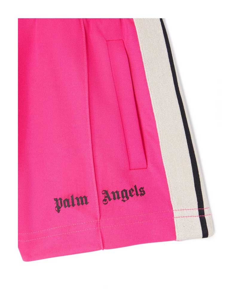 Bermuda track in acetato di Palm Angels junior. Presenta vita elasticizzata, stampa logo sul davanti, due tasche verticali e bande laterali écru in maglia.