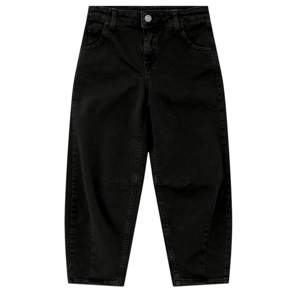 Jeans realizzati in denim nero. Modello cinque tasche. Chiusura frontale con bottone e zip, vita regolabile grazie ad elastico interno con i bottone e passanti per la cintura. Sono decorati con placca logo in metallo applicata sul retro.