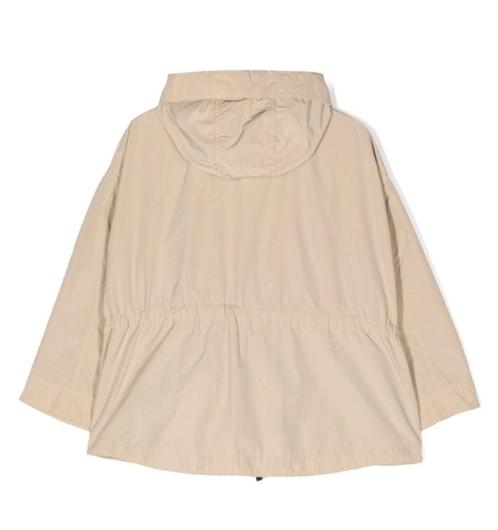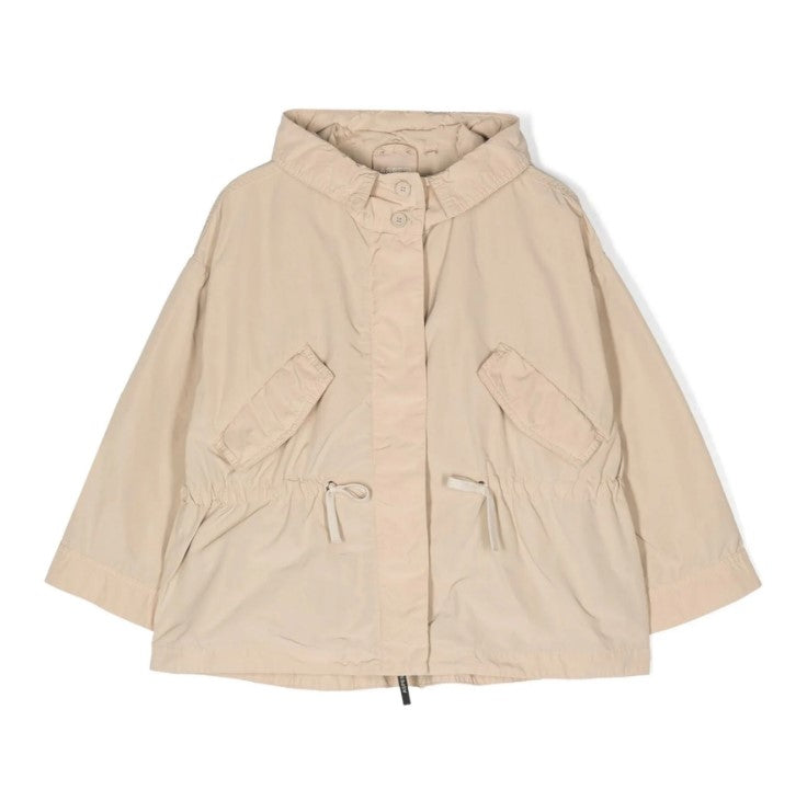 Giubbino in nylon con cappuccio, modello parka, chiusura anteriore con zip e clips. Tasche applicate sul davanti, coulisse in vita.