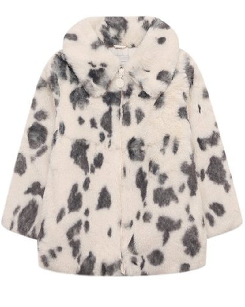 Eco-pelliccia da bambina caratterizzata da una texture morbida e soffice. Presenta collo a punta, maniche lunghe, chiusura frontale con cerniera e tasche laterali a filo.