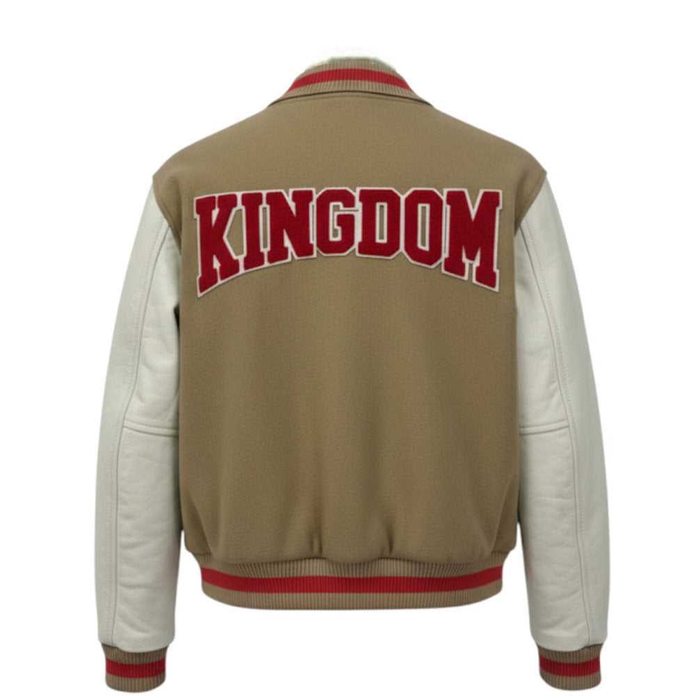 Giacca college leggermente imbottita, realizzata in panno di lana. Presenta colletto a costine, chiusura frontale con bottoni a pressione, maniche lunghe in pelle di vitello a contrasto, polsi a costine, due tasche laterali all'americana e orlo a coste. È decorata con patch effetto punto spugna applicata sul petto e sul retro.
