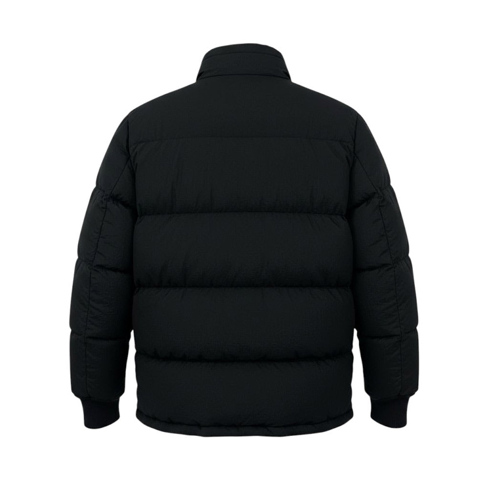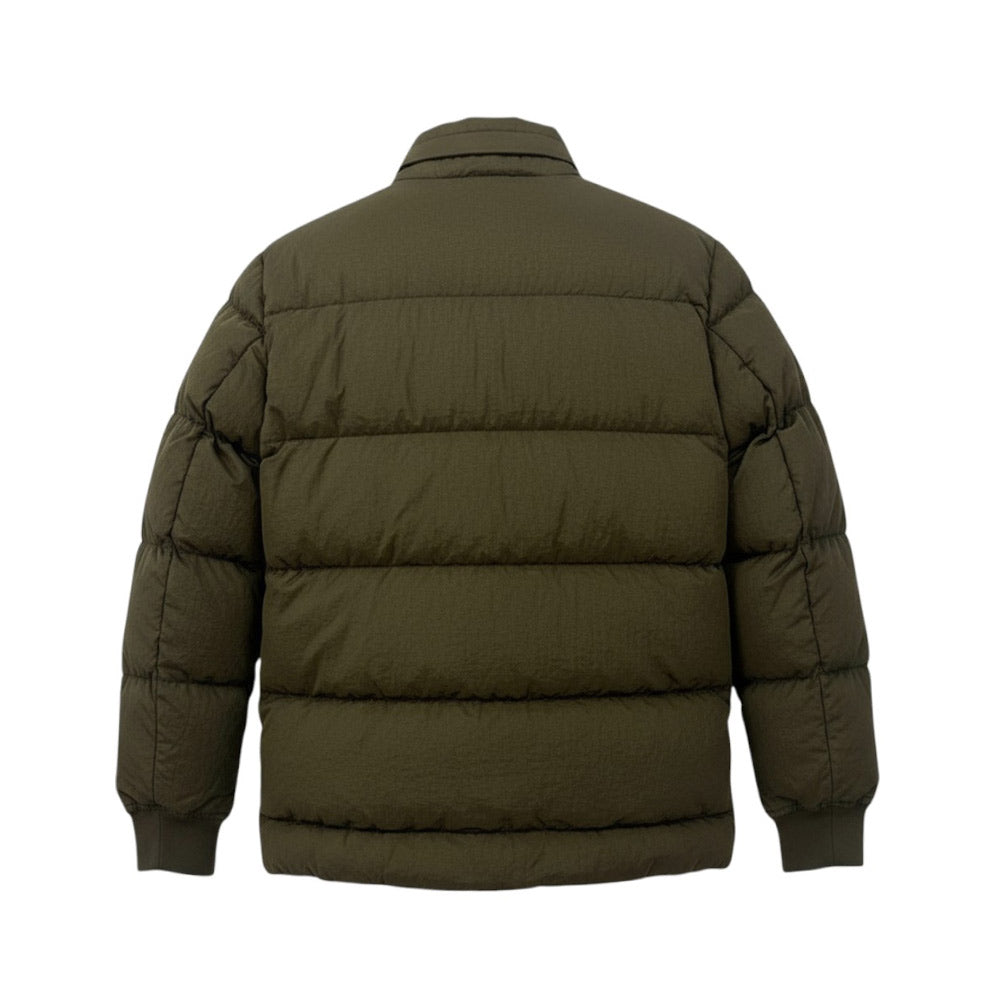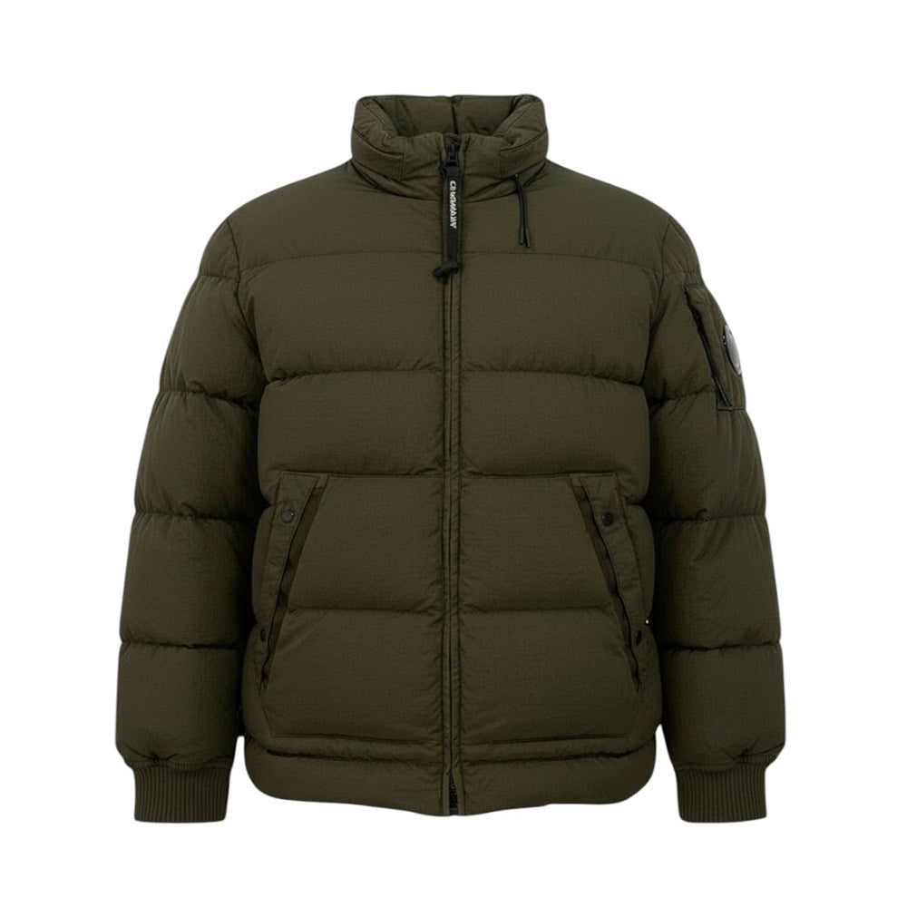 Piumino imbottito realizzato in nylon effetto goffrato. Presenta design trapuntato, collo alto con cappuccio estraibile, chiusura frontale con zip, maniche lunghe con polsi a costine, due tasche laterali all'americana e orlo dritto con coulisse regolabile. È decorato con applicazione lente C.P. Company sulla manica.