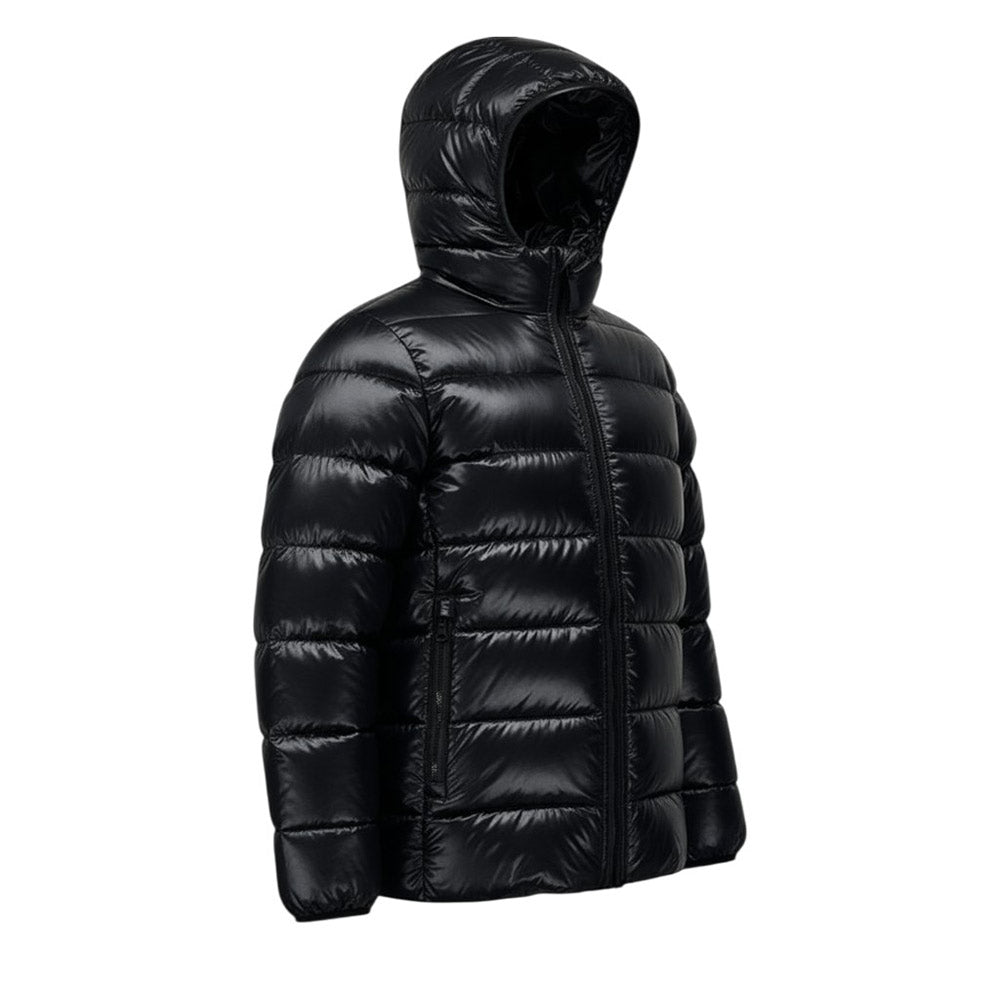 Giubbino imbottito realizzato in nylon. Presenta design trapuntato, cappuccio fisso, chiusura frontale con zip, maniche lunghe con polsi elasticizzati, due tasche laterali a filetto con zip e orlo dritto. È decorato con patch logo applicata sulla manica.
