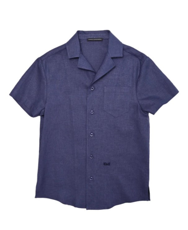 Camicia a manica corta realizzata in misto lino da bambino, chiusura frontale con bottoni, taschino frontale, logo ricamato sul davanti.