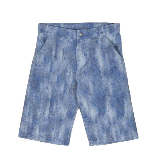 Bermuda in denim di cotone da bambino, stampa logo all-over, chiusura frontale con bottone a pressione e zip, tasche laterali america, due tasche applicate sul retro.
