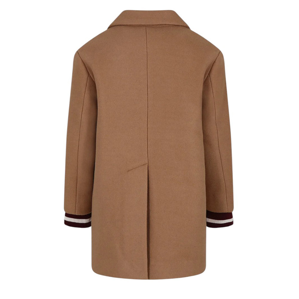 Cappotto monopetto realizzato in misto lana. Presenta collo con revers, chiusura frontale con bottoni, maniche lunghe con polsi a coste, tasche con patta sul davanti, orlo dritto e spacco sul retro. È decorato con patch logo applicata sul petto.