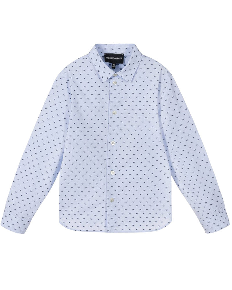 Camicia azzurra da bambino, realizzata in popeline di cotone. Presenta colletto a punta, chiusura frontale con bottoni e maniche lunghe. È decorata con micro stampa iconica di aquila all-over.