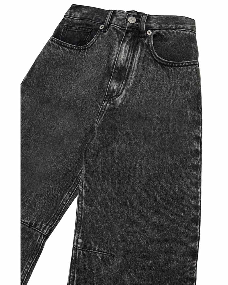 Jeans gamba dritta realizzati in denim di cotone. Modello cinque tasche. Presentano lavaggio con sfumature a contrasto, chiusura frontale con bottone e zip, cuciture ergonomiche sulle ginocchia e label logo applicata sul retro.