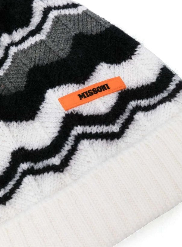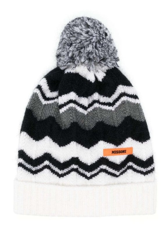 Cappello in lana con pon pon, fantasia all over, risvolto a costa con logo applicato.
