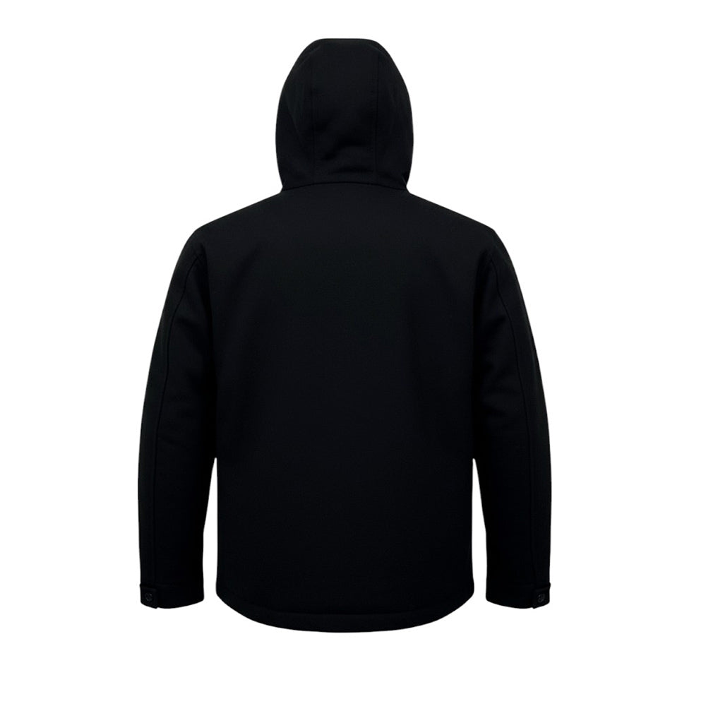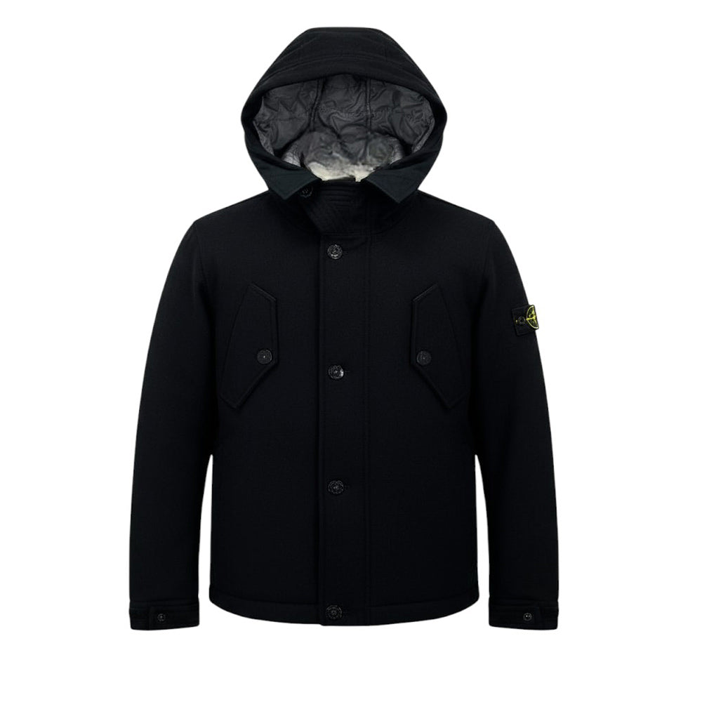 Cappotto monopetto imbottito, realizzato twill di misto lana. Presenta colletto a punta, cappuccio fisso, chiusura frontale con zip e bottoni, fodera in nylon trapuntata, maniche lunghe, due tasche scaldamani con patta, due tasche a filetto con zip e orlo dritto. È decorato con Compass Stone Island applicata sulla manica.