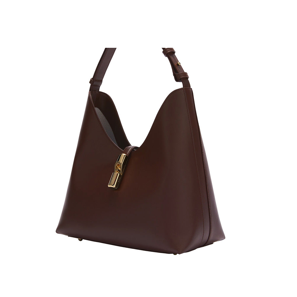 La borsa è arricchita da una fascetta abbinata impreziosita dal nuovo hardware ciclindrico con pesetto decorato dall'iconico logo Arco Furla che tiene chiuso il modello. L'interno aperto è capiente e spazioso per contenere i propri essentials.