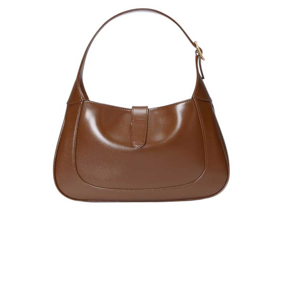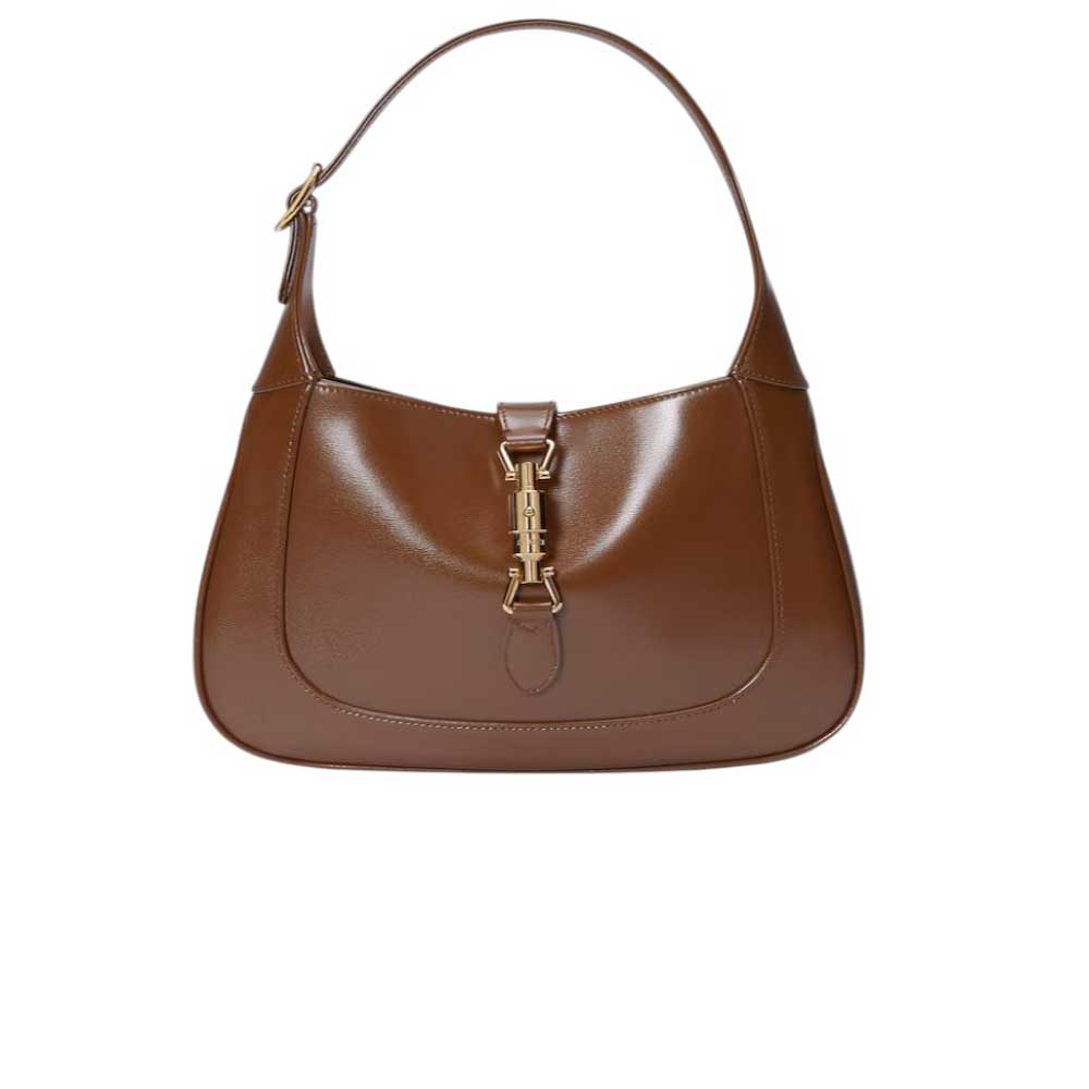 Goditi lo stile sofisticato della Borsa a spalla Jackie 1961 misura piccola di Gucci, in pelle marrone con finiture color oro. Grazie alla tracolla staccabile, puoi indossarla a mano, a spalla o a tracolla. L'interno è foderato in microfibra con una tasca aperta e viene fornita con una seconda tracolla per un look versatile.
