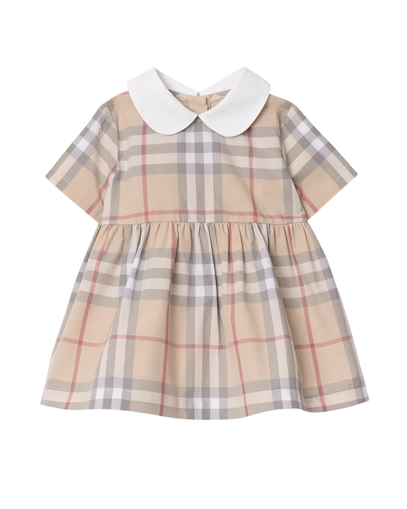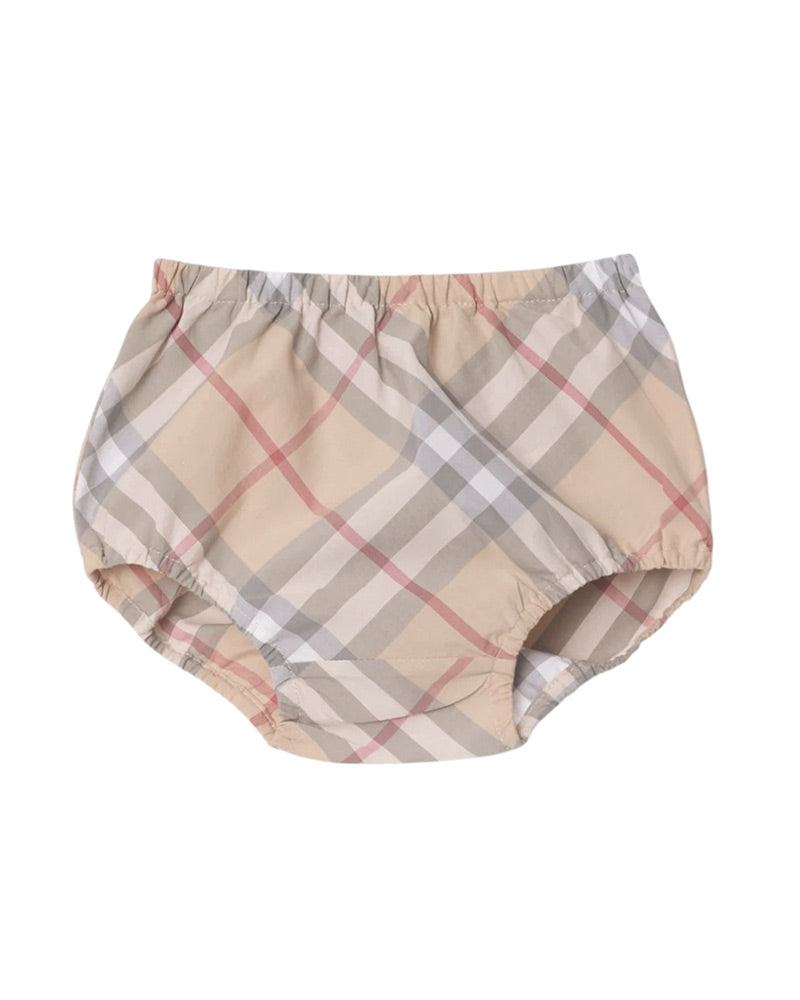Vestina a maniche corte in popeline di cotone intessuta con Burberry Check. Il modello è caratterizzato da colletto Peter Pan, chiusura posteriore con bottoni e pantaloncini bloomer coordinati con vita elasticizzata.