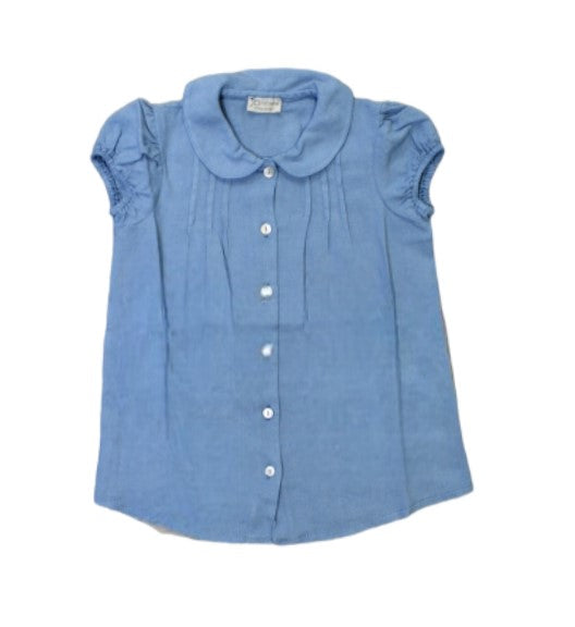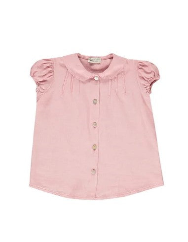 Camicia in lino manica corta a sbuffo, colletto tondo, chiusura frontale con bottoni, pieghe cucite sul davanti.