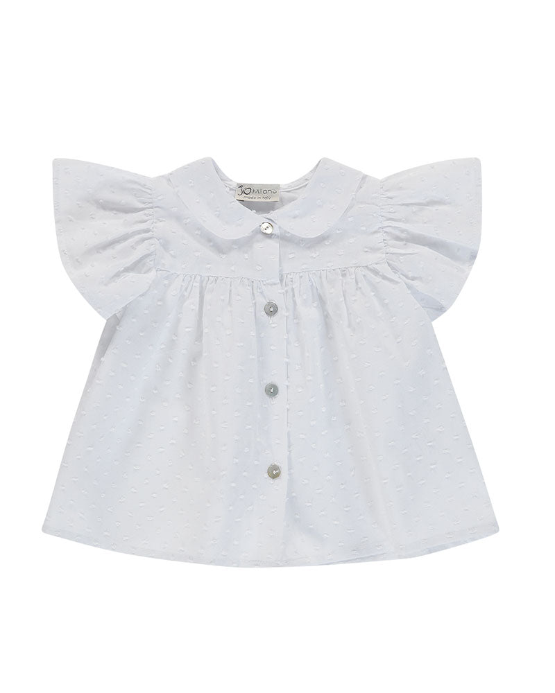 Camicia in cotone a fantasia rigata, maniche corte, colletto tondo, chiusura frontale con bottoni.