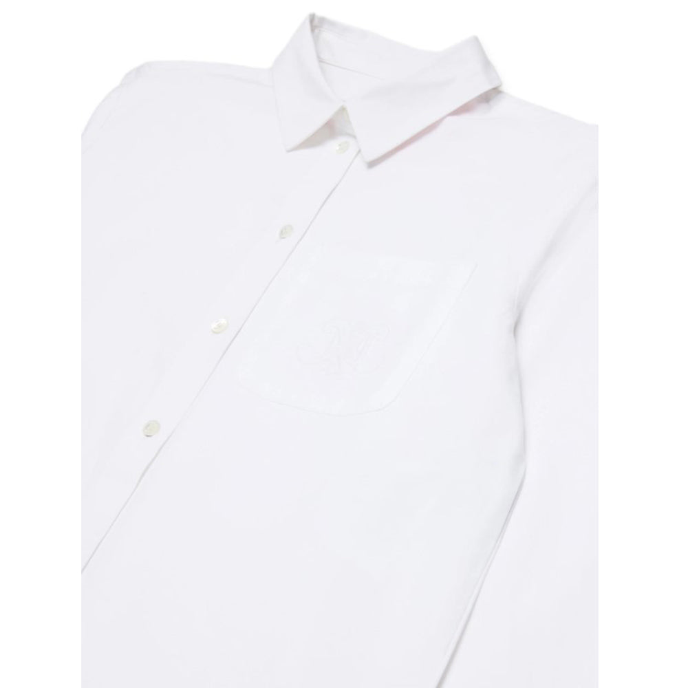 Camicia realizzata in popeline di cotone, caratterizzata da colletto a punta, chiusura frontale con bottoni, maniche lunghe, polsini abbottonati e orlo asimmetrico. È decorata con taschino applicato sul petto e emblema monogramma ricamato in tono.