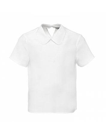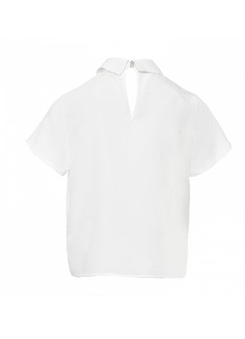 Camicia in seta con collo rotondo a manica corta, chiusura sul retro.