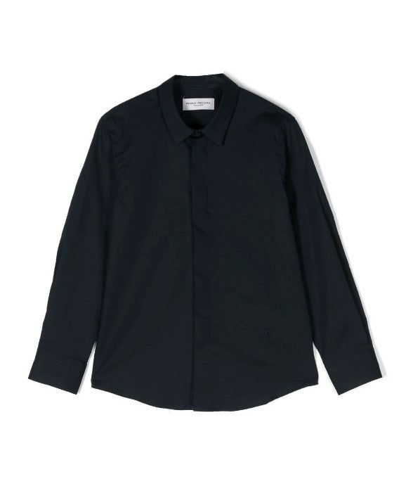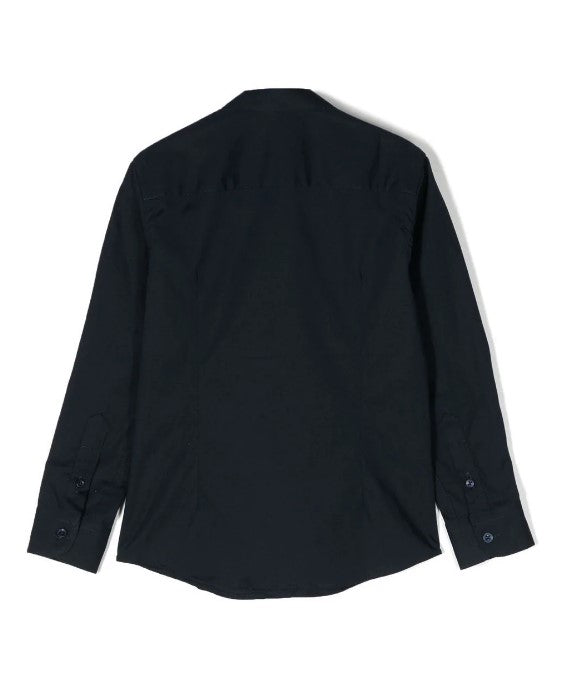 Camicia bambino tinta unita con colletto classico a manica lunga, realizzata in cotone, chiusura anteriore nascosta con i bottoni.