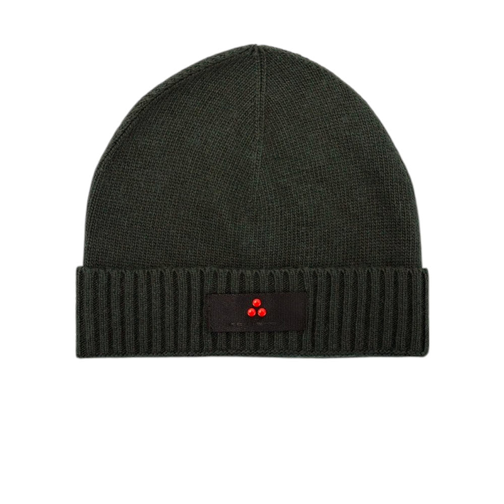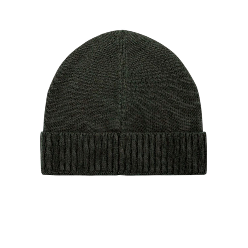 Cappello verde da bambino realizzato in misto lana, caratterizzato da lavorazione a maglia, risvolto a coste e patch logo applicata sul davanti.