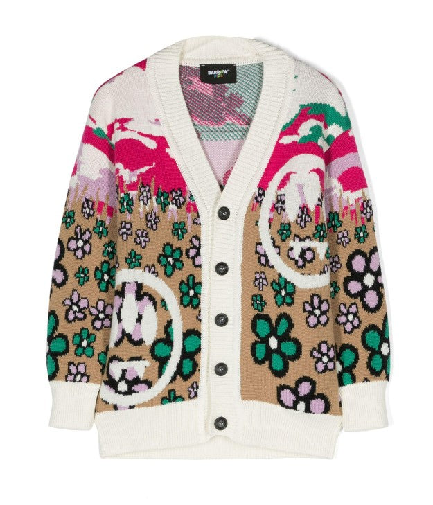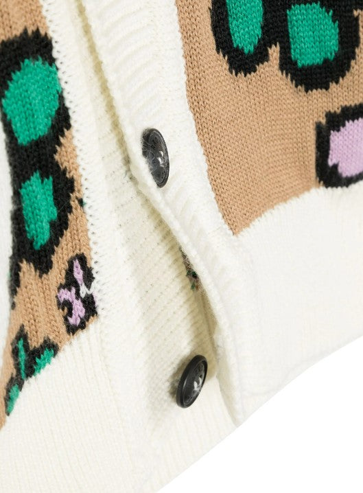 Maglia cardigan scollo a V, chiusura frontale con bottoni, finiture in contrasto, fantasia all over.