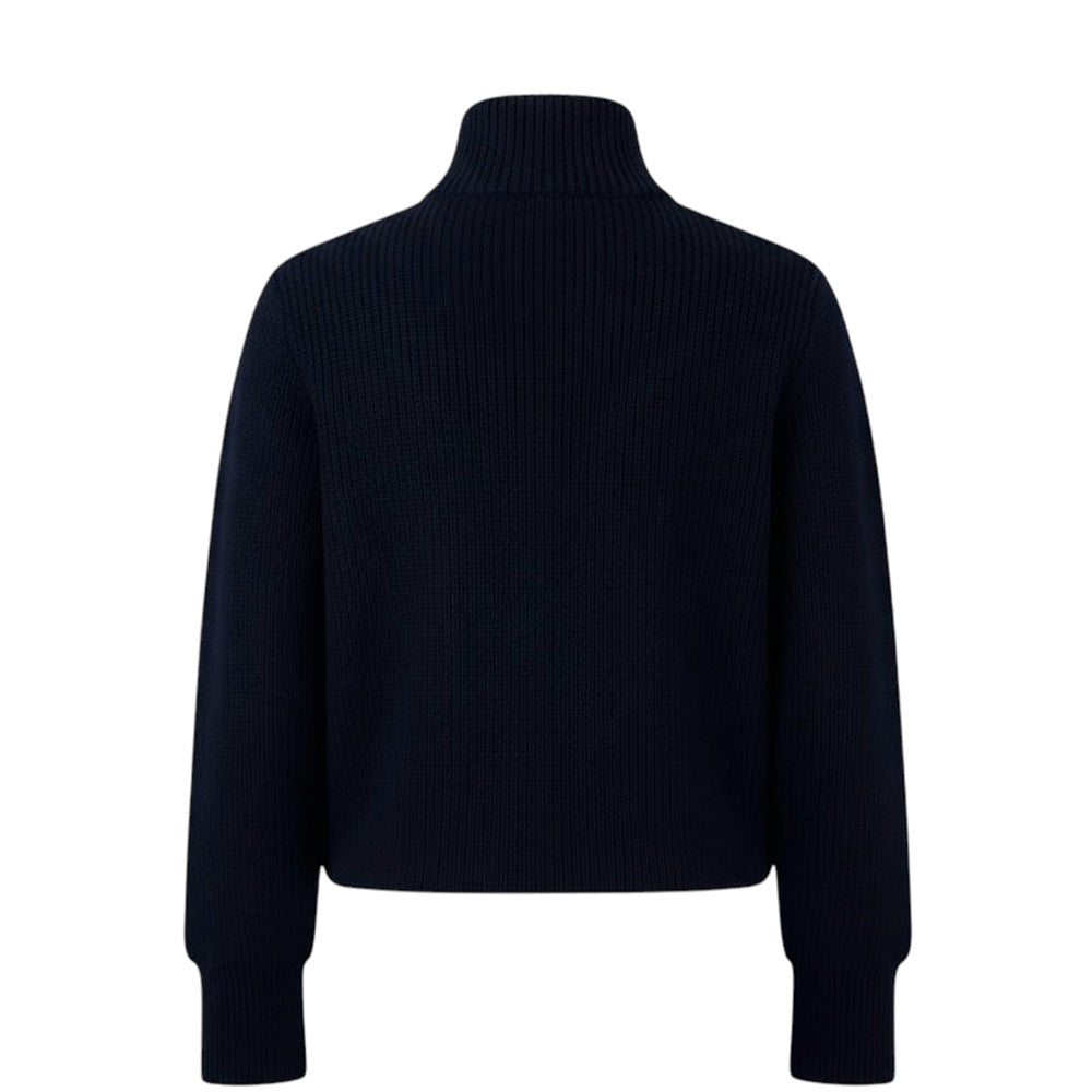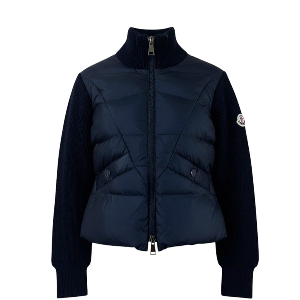 Cardigan realizzato in lana vergine, con imbottitura in piumino. Presenta colletto alto, parte anteriore in nylon trapuntato, chiusura con zip, maniche lunghe, due tasche a filetto sul davanti e orlo dritto. È decorato con patch logo applicata sulla manica.