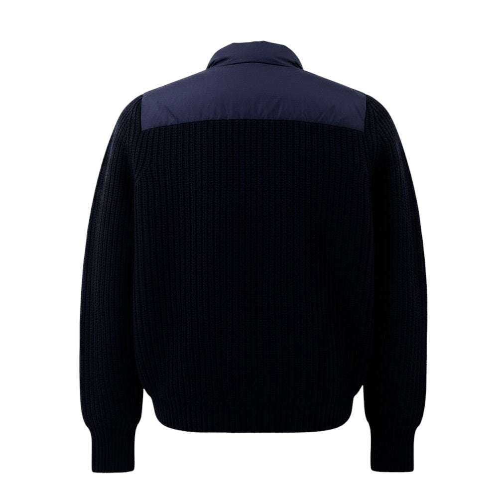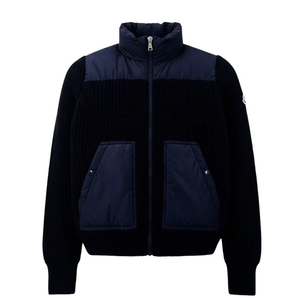 Cardigan realizzato in lana vergine, imbottito in piumino, con dettagli in nylon. Presenta collo alto, chiusura frontale con zip, maniche lunghe con polsini a coste, due tasche applicate sul davanti e orlo a coste. È decorato con patch logo applicata sulla manica.