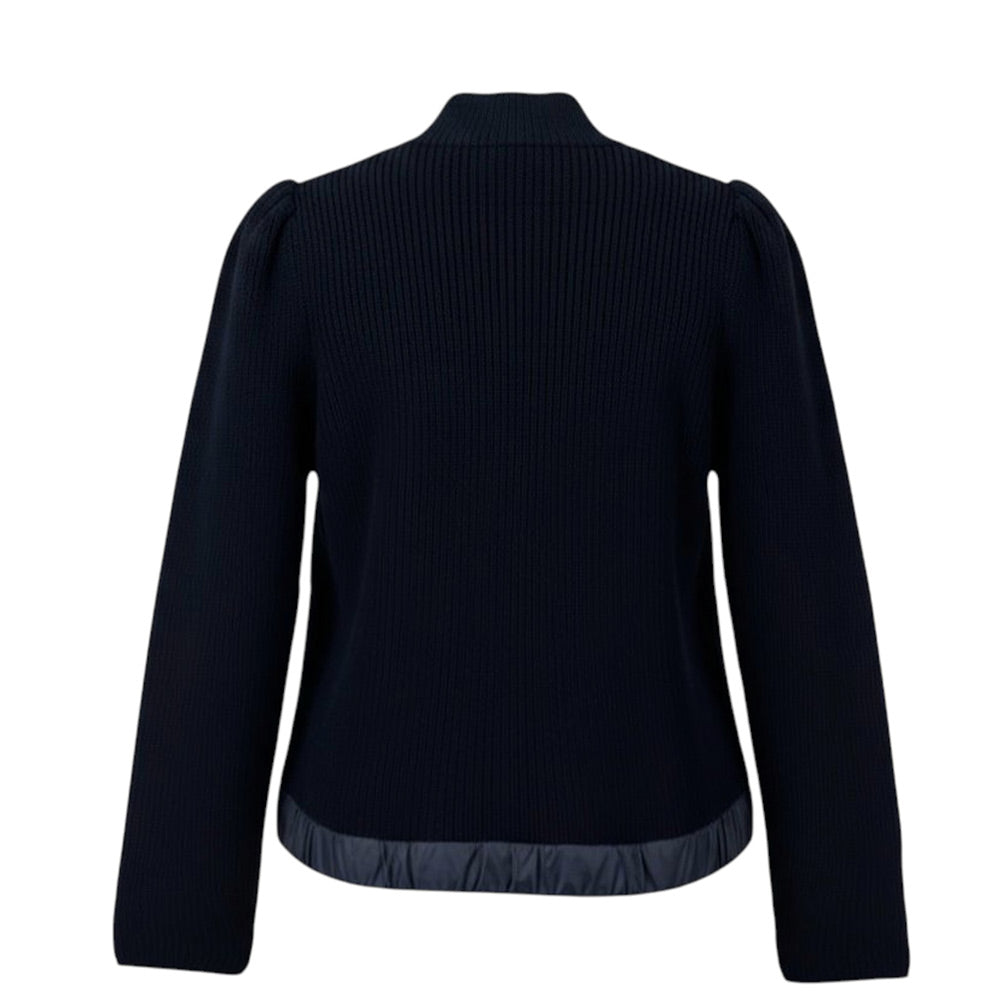 Cardigan realizzato in lana vergine, con imbottitura in piuma. Presenta colletto alto, parte anteriore in nylon trapuntato, chiusura frontale con zip, spalline arricciate, maniche lunghe, due tasche laterali a filetto e orlo svasato. È decorato con patch logo applicata sulla manica.