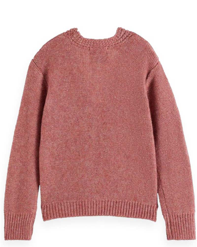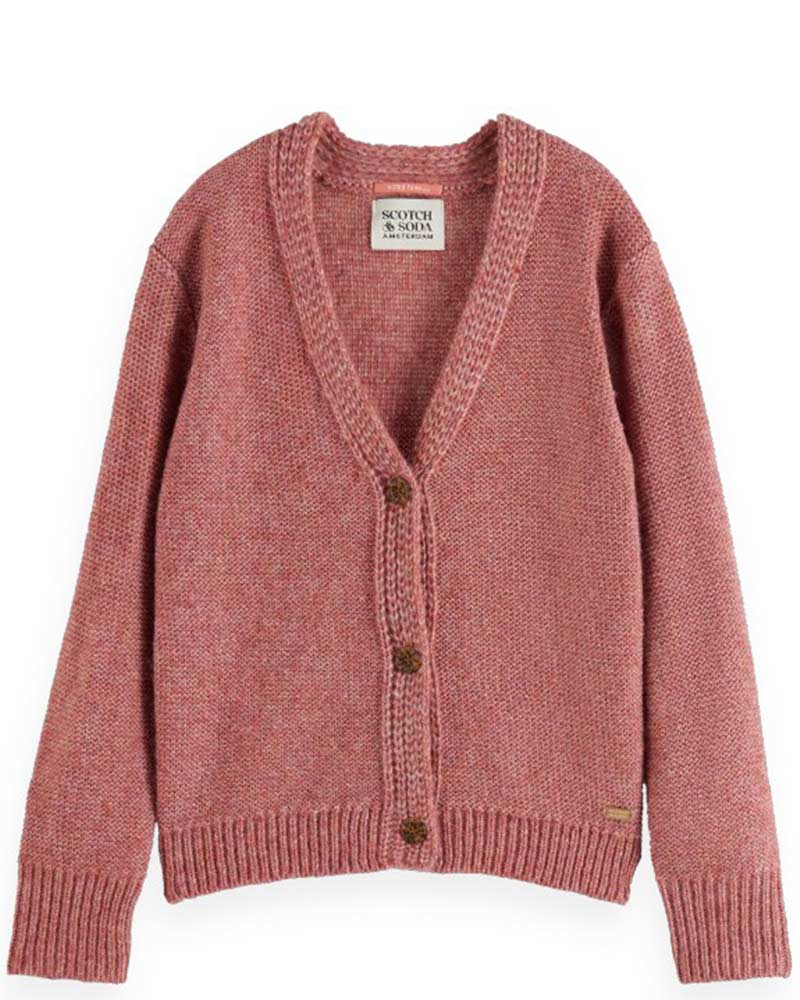Cardigan realizzato in misto lana con dettagli lurex da bambina. Presenta scollo a V, chiusura frontale con bottoni, maniche lunghe e rifiniture a coste. È decorata con applicazione logo in metallo sul davanti.